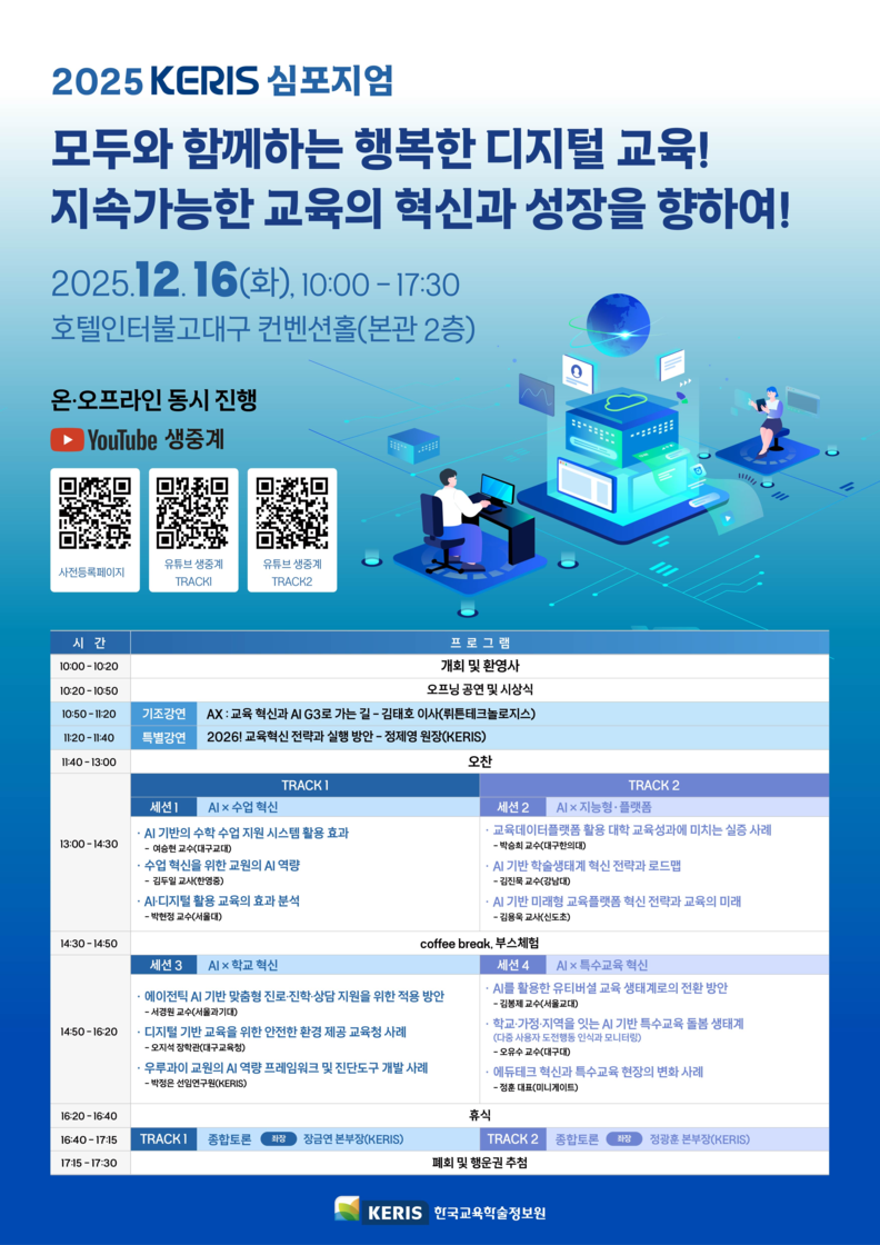 한국교육학술정보원(케리스)은 16일 호텔인터불고대구에서 ‘모두와 함께하는 행복한 디지털 교육! 지속 가능한 교육의 혁신과 성장을 향하여!’를 주제로 심포지엄을 개최한다. 정부의 인공지능(AI) 3대 강국(G3) 도약과 모두를 위한 AI 인재양성 방안에 기반해 지속 가능한 교육의 혁신과 성장을 위한 방안을 모색하고 논의하는 자리로 운영될 예정이다.