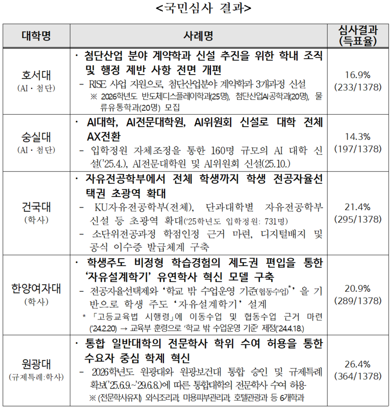 ‘고등교육법 시행령’과 ‘대학설립·운영 규정’ 개정 등 규제 개선 내용을 토대로 첨단분야 계약학과 및 입학정원 증원 등을 활용한 첨단분야 학과 신설, 소단위 전공 과정과 연계한 전공자율선택제 확대 등 사례 23개가 응모됐다. 1단계 전문가 평가 후 2단계 온라인 국민심사(8~10일, 소통24 https://sotong.go.kr 온라인 투표)를 통해 최종 5개 대학이 뽑혔다.
