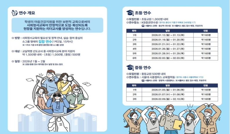 심민철 학생건강안전정책국장은 “사회정서교육은 학생이 자신과 타인의 감정을 이해하고, 타인과 건강한 관계를 맺는 힘을 기르는 데 꼭 필요하다”며 “모든 학생이 건강하고 행복한 사회 구성원으로 성장할 수 있도록 학교뿐 아니라 가정과 지역사회 등의 정책적 지원을 강화하겠다”고 말했다.