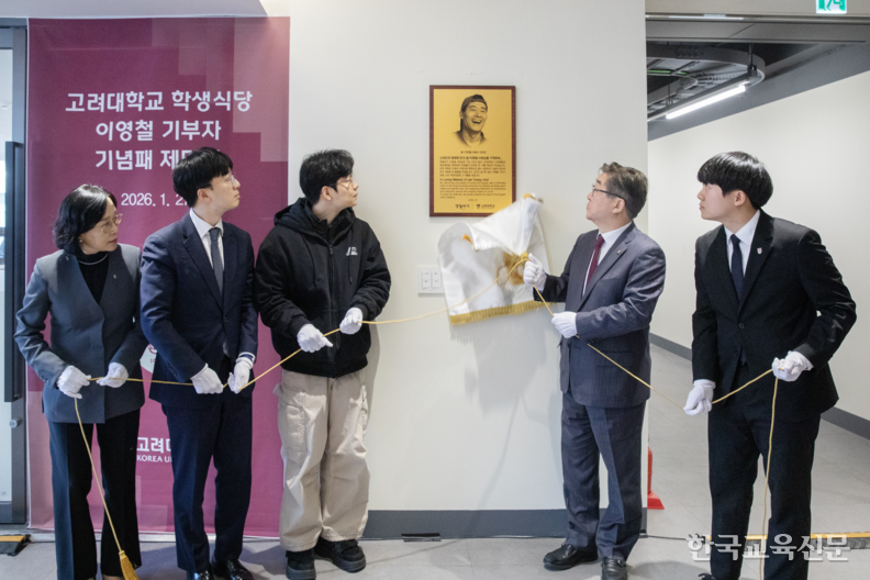 고려대는 이날 오후 3시 본관과 한투스퀘어 학생식당에서 ‘고 이영철 영철버거 사장 학생식당 기념패 제막식’(사진)을 거행했다. 행사에는 김동원 고려대 총장과 박현숙 학생처장, 전재욱 대외협력처장, 고인의 가족 등 5명이 참석해 환담과 감사패 전달, 기념패 제막 순으로 진행됐다.