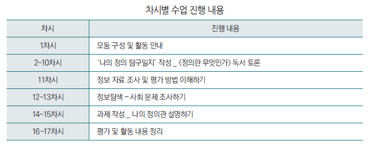 수업은 총 17차시로, 읽기와 탐구활동을 두 축으로 진행했다. 학생들은 <정의란 무엇인가>를 읽고 토론하며 자신만의 정의관을 형성하고, 현실의 사회 문제를 조사해 해당 문제를 어떻게 바라보고 해석하는지를 설명했다. 이 과정을 통해 최종적으로 자신만의 정의관을 하나의 논리로 정리했다.