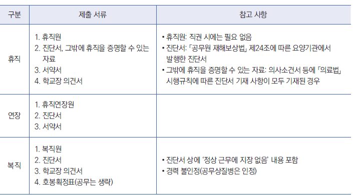 • 처음에 제출한 진단서나 신청한 휴직기간이 끝났더라도, 휴직자가 요양이 더 필요하다는 객관적 증빙서류를 제출하였을 경우 연장 가능함.