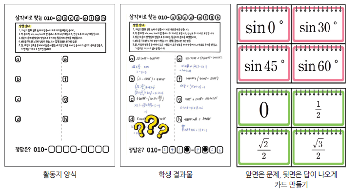 ‘삼각비’ 단원은 고등학교 때 배우는 ‘삼각함수’ 단원과 밀접한 관련이 있어서 학생들이 깊이 있게 배웠으면 하는 마음이 컸다. 낯선 용어와 기호로 인해서 ‘삼각비’에 대한 진입장벽이 높다. ‘삼각비’의 유용성을 느낄 수 있도록, 첫 시간에는 중학교 2학년 때 학습한 닮음 개념을 활용해서 ‘각도기’와 ‘자’로 높이를 측정하는 활동을 하였다. 특수각에 대한 삼각비는 외우고 있어야 하므로 학생들이 모둠에서 돌아가면서 외울 수 있도록 연습하는 시간을 주고, 카드를 만들어서 학급의 모든 학생이 답할 수 있게 연습하였다. 그리고 자신의 전화번호가 나오게 문제를 만든 후, 친구들과 교환해서 정답을 맞히는 활동을 하면서, 문제를 만들어보는 경험을 할 수 있게 구성하였다.