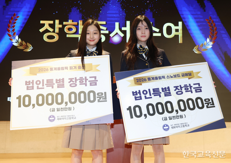 세화여고(교장 오삼찬)가 2026 밀라노-코르티나담페초 동계올림픽에서 활약하며 학교의 명예를 높인 재학생 최가온과 신지아 선수에게 특별장학금을 수여했다. 태광그룹 학교법인 일주세화학원은 3일 교내 강당에서 열린 고3 시업식에서 두 선수에게 재단 특별장학금 1000만원을 각각 전달하며 그간의 노고를 격려했다.