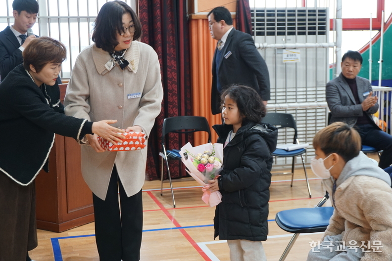 개식사를 시작으로 초등 및 유치원 입학 허가 선언, 축하 선물 수여를 한 후, 교장 선생님의 약력 소개 및 환영사를 했다. 제28대 류은주 교장은 “먼저 웃으며 인사하는 교장선생님이 되겠습니다. 여러분의 꿈을 응원하고 우리 학교가 안전하고 행복한 배움터가 되도록 노력하겠습니다. 아울러 학부모님께 말씀드립니다. 아이들이 학교에 적응하는 데 시간이 필요합니다. 따뜻한 격려와 기다림으로 자녀 응원을 부탁합니다. 그리고 매일 아침 든든하게 잘 먹고 기분 좋게 등교할 수 있도록 해 주세요”라고 말했다.