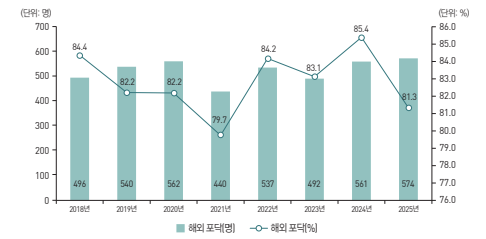특히 이공계 분야에서 이러한 경향이 두드러졌다. 자연계열은 조사 기간 대부분에서 포닥 목적 비율이 90% 이상을 기록했으며, 2025년에는 의약계열이 92.4%로 가장 높은 수준을 보였다. 자연계열 역시 91.3%로 높은 비중을 유지했다.