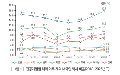 분석 결과 자연‧공학 계열에서 해외 이주 의향이 상대적으로 높게 나타났다. 2025년 기준 자연계열 신규 박사의 17.7%, 공학계열은 11.5%가 해외 이주 계획이 있다고 응답해 전체 전공 가운데 가장 높은 수준을 보였다.