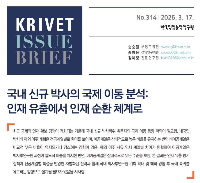 한국직업능력연구원은 17일 ‘국내 신규 박사의 국제 이동 분석: 인재 유출에서 인재 순환 체계로’를 주제로 한 ‘KRIVET Issue Brief 314호’를 통해 국내 박사학위 취득자의 해외 이주 계획과 특징을 분석했다. 분석 대상은 2018년부터 2025년까지 국내 대학에서 박사학위를 받은 내국인 신규 박사 7만167명이다.