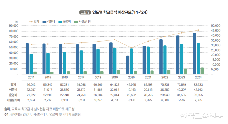 운영 규모 확대와 함께 재정 투입도 빠르게 증가했다. 2024년 기준 학교급식 예산은 8조2633억원으로 2014년 대비 약 2조6620억원 늘었다. 식품비 비중이 가장 크고 운영비와 시설설비비가 뒤를 잇는 구조다. 식재료 가격 상승과 인건비 증가, 노후 급식시설 개선과 자동화 설비 도입 등이 비용 증가를 견인한 요인으로 분석된다.
