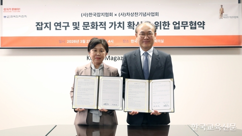 한국잡지협회(회장 백동민·사진 오른쪽)와 (사)차상찬기념사업회(이사장 정현숙)는 27일 서울 영등포구 잡지회관에서 잡지의 문화적 가치 확산 및 학술 연구 발전을 위한 업무협약(MOU)을 맺었다.