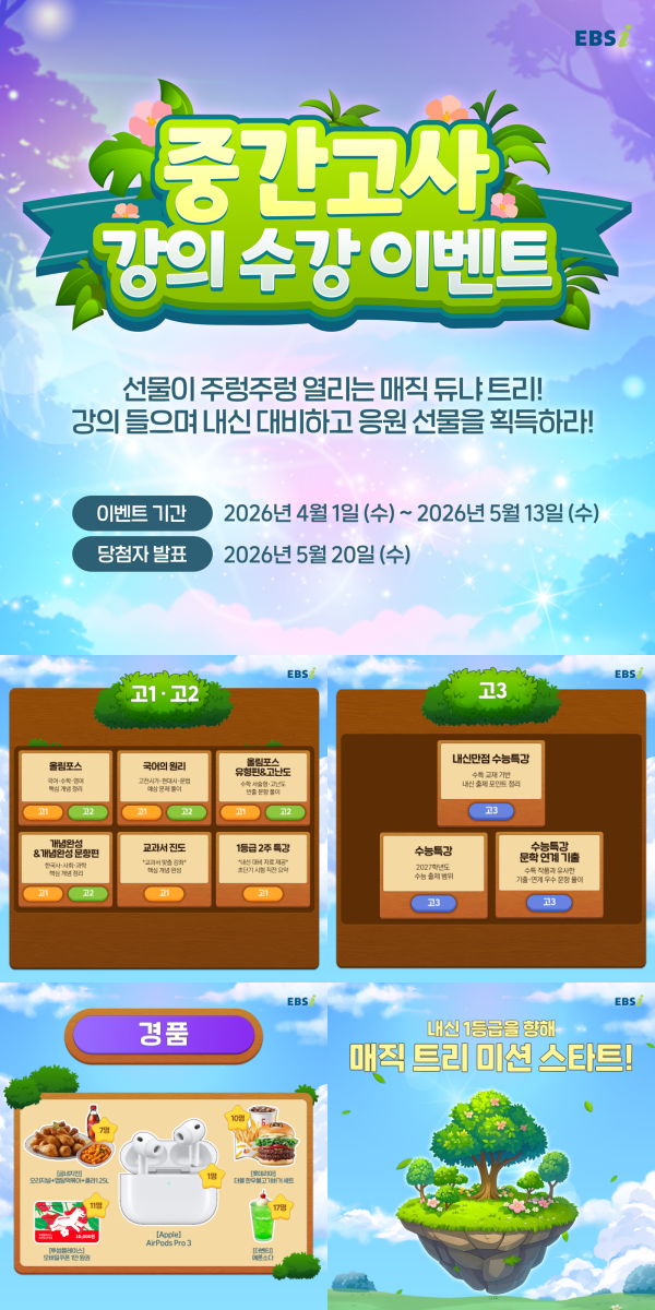 이번 이벤트는 고1~고3 전 학년을 대상으로, 학습 동기를 강화하기 위해 마련됐다. 이벤트 페이지 내 중간고사 대비 강좌를 수강하면 누적 수강 수에 따라 에어팟, 치킨 세트, 햄버거 세트, 카페 모바일 상품권, 음료 쿠폰 등 경품에 자동 응모된다. 이와 함께 EBS 교재 할인에 사용할 수 있는 ‘꿈포인트’도 제공된다.