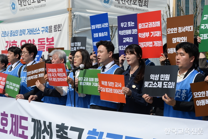 이에 대해 교총은 “학부모의 보복성 악성 민원이나 무고한 아동학대 신고에 대한 공포가 교사들의 입을 막고 있다”며 “교사가 정당한 생활지도를 하다가도 정서적 학대로 몰려 법정에 서야 하는 기막힌 현실이 방치되는 것”이라고 설명했다.