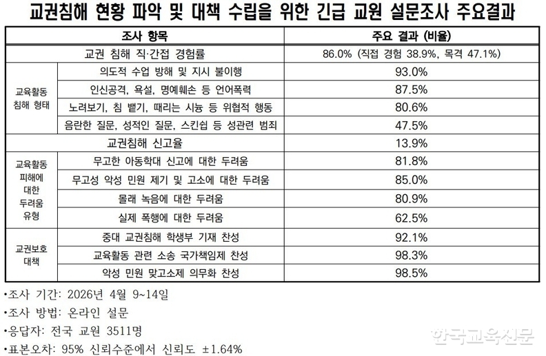 기자회견에서는 ‘한국교총 긴급 교원 설문조사’ 결과도 발표됐다. 조사 결과 지난 1월 이재명 정부의 첫 교권보호 대책 발표·시행 이후 ‘교권보호가 더 잘 이뤄지고 있다’는 교원은 12%에 불과했고, 응답자의 65.8%는 ‘교육활동이 보호되지 않고 있다’고 답했다. 지난 1년간 교육활동 침해를 직접 경험하거나 동료의 피해를 목격했다는 교원은 86.0%였다. 교육활동 침해 형태에 대해서는 의도적 수업 방해 및 지시 불이행(93.0%), 언어폭력(87.5%), 위협적 행동(80.6%), 성관련 범죄(47.5%) 순이었다. 반면 교권 침해 신고율은 13.9%에 불과했다.