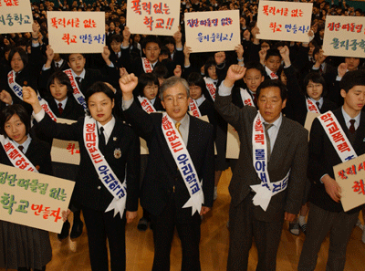 서울 노원구 을지중학교(교장 이명구)는 17일 전교생이 모인 가운데 강당에서 최근 사회적 문제가 되고 있는 학교폭력과 불량써클을 몰아내자는 자정 결의대회를 가졌다.