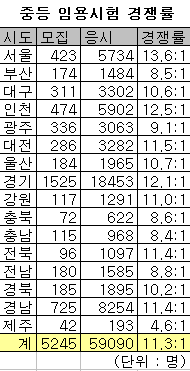 지역별로는 서울이 423명 모집에 5734명이 응시해 13.6대 1, 인천이 474명 모집에 5902명이 응시해 12.5대 1, 경기가 1525명 모집에 1만8453명이 응시해 12.1대 1의 경쟁률을 나타냈다. 경쟁률이 낮은 곳은 제주 4.6대 1, 충북 8.4대 1, 부산 8.5대 1, 충남 8.6대 1 전북 8.8대 1 등이다.