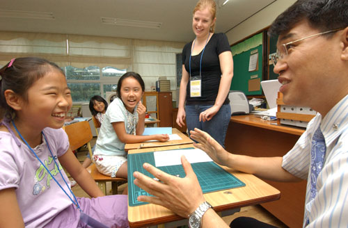 경인교육대학교부설초등학교는 8일부터 4일간 본교 및 파주 영어마을에서 체험 활동 중심의 영어캠프를 운영하고 있다. 원어민 교사와 고준명 경인교대부설초 교사가 함께 수업을 진행하고 있다.