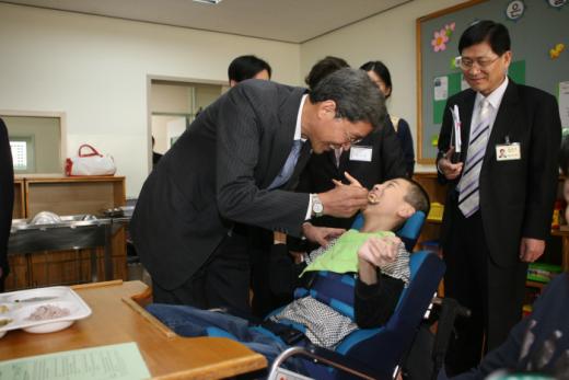 김도연 교육과학기술부 장관은 12일 지체장애 특수학교인 서울정민학교(교장 정연화)를 방문, 관계자들을 격려했다. 사진은 김 장관이 혼자 식사할 수 없는 학생들을 위한 점심식사 도우미 봉사활동을 하는 모습.