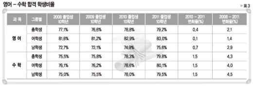 <표3>은 2008년에서 2011년에 졸업할 학생들 중 10학년에서 영어와 수학과목에서 합격한 학생비율을 나타낸다.
