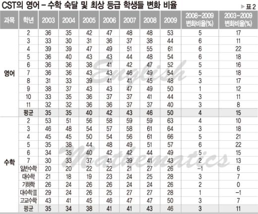 <표2>는 CST의 영어와 수학의 숙달 및 최상의 등급 학생들의 변화 비율을 연도별 나타내고 있다.