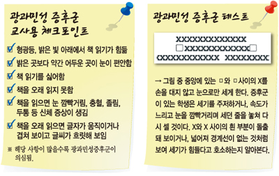 이러한 증상은 나이가 들수록 더욱 심해져 컴퓨터 작업, 운전, 업무 등에도 영향을 미칠 수 있다. 제시된 ‘체크포인트’로 교실에서 선생님이 간단하게 광민감 증후군 학생을 찾아내보자.