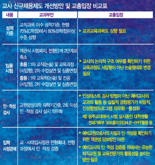 교과부 교원정책과 강순나 연구관은 “생활지도에 대한 요구 등 변화하는 교육 환경에 맞춰 인‧적성 요소를 적극적으로 반영하고 사례중심, 서술형시험으로 ‘세대교체’한다는 취지”라고 설명했다. 강 연구관은 “교사라는 직업이 안정적이라는 생각에 그냥 성적에 맞춰 응시하는 사람이 많았다”며 “개선방안이 적용되면 정말 교사가 적성에 맞고 학생을 사랑하는 인성을 갖춘 사람이 임용될 수 있을 것”이라고 기대했다.