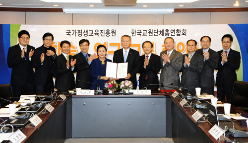 한국교총과 국가평생교육진흥원은 13일 진흥원 스마트회의실에서 업무협약식을 갖고 학생·교사·학부모의 평생교육·학습 기능 강화 및 문화 확산을 위해 협력하기로 했다.