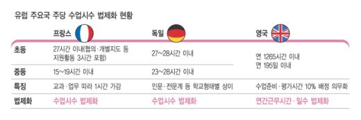 교육부는 첫 대통령 업무보고에서 ‘표준수업시수 법제화’를 추진해 2014년부터 단계적으로 적용하겠다고 밝히고 11월 ‘교원의 수업 시간에 관한 규정’을 제정하겠다는 구체적 로드맵을 제시했다. 그러나 초·중등교육법 개정을 추진하겠다는 4월이 한참 지났지만 방향조차 잡히지 않고 있다. 그도 그럴 법하다. 1990년대 이후 학년, 교과, 보직, 지역 등 여건에 따라 입장이 달라 결론을 내리지 못하고 수면 아래로 내려간 제도기 때문이다. 본지는 그 해법을 찾기 위해 유럽 주요국 표준수업시수 운영 형태를 조명해 본다.