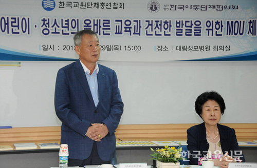한국교총(회장 안양옥)과 한국아동단체협의회(회장 변주선)는 29일 서울 대방동 대림성모병원 회의실에서 MOU를 갖고 어린이와 청소년의 올바른 교육관 확립과 인성 및 권리를 위해 협력하기로 했다.