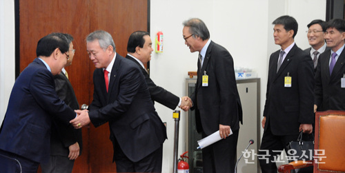 교총을 비롯한 교육계 관계자 30여 명은 4일 오전 여의도 국회에서 문희상 새정치민주연합 비대위원장을 만나 새누리당이 추진하고 있는 공무원연금 개악 저지에 힘써줄 것을 요구했다.