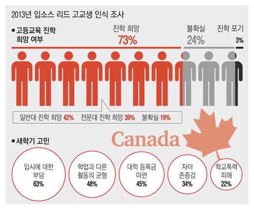 캐나다의 여론조사기관 입소스 리드(Ipsos-Reid)가 지난해 7월 22~26일 고교생 803명을 대상으로 한 설문조사 결과 고등교육 진학을 희망하는 학생이 73%였다. 42%는 일반대, 39%는 전문대, 나머지 19%는 양자 중 어느 쪽을 결정하지 못한 상태였다. 고등교육 진학 여부를 결정하지 못한 학생은 24%였다. 대학진학 포기자는 3%에 불과했다. 이런 통계는 캐나다에서 대학교육이 보편화됐다는 것을 보여준다.