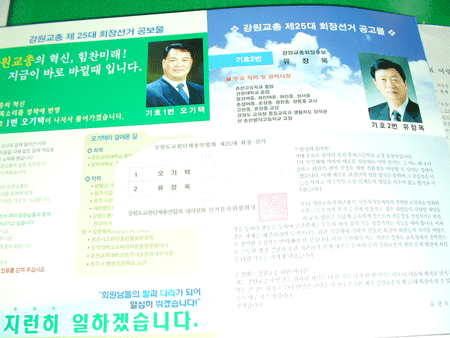 제25대 강원교총 회장을 뽑는 투표가 11일(수) 각 학교 분회로 투표안내문 및 투표용지 발송이 완료된 상태에서 14(토)~21일(토)까지 일주간에 걸쳐 본격적으로 시작된다. 회장후보로는 기호1번 오기택 후보(원주 명륜초등학교 교감)와 기호2번 유창옥 후보(춘천 봉의고등학교 교장) 2파전으로 각축을 벌이게 되었다. 구체적인 선거일정과 방법은 다음과 같다.