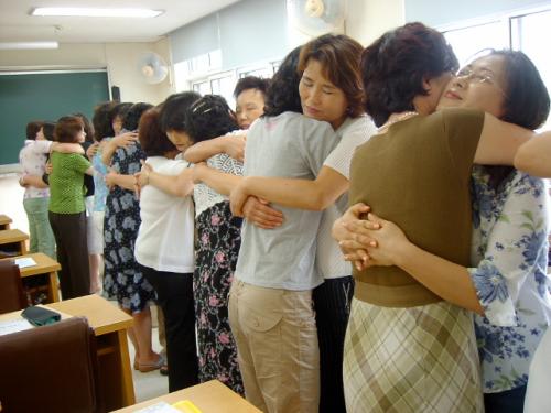 사회자의 독백에 주르르 눈물을 흘리고 맙니다. 내가 어머니가 되어 이제야 어머니의 자식 사랑을 알것 같습니다. 이제는 내가 어머니를 꼬옥 껴안아 드려야겠습니다. 연수생들은 두 줄로 서서 짝을 바꿔가며 상대방을 안아봅니다. 맨처음에는 상대방의 눈 속에서 나를 찾아낼 때까지 두 눈을 응시합니다.