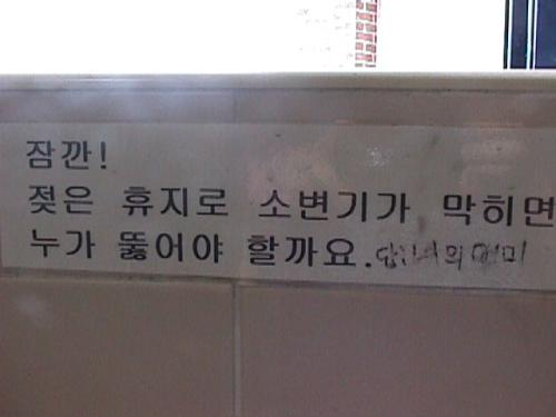 그래도 역시 깨끗해지지 않았다. 그런데 며칠 후에 갑자기 화장실의 문구 옆에 답변 비슷한 것이 있었다. 원래 문구(리포터가 쓴 문구) "잠깐 젖은 휴지로 소변기가 막히면 누가 뚫어야 할까요" 그 옆의 답변(학생들이 낙서로 답해 놓은 문구)"너의 애미" ?????