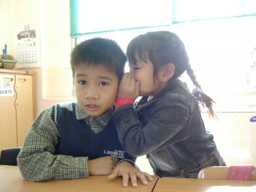 선생님께서 들려 주시는 말을 친구에게 전하고 있는 중이예요. 귓속에 대고 살며시 속삭이는 예쁜 모습을 여러분에게 공개하지 않을 수 없군요. 문제는 오늘 세수를 하지 않고 학교에 온 기복이를 주제로 하였습니다.