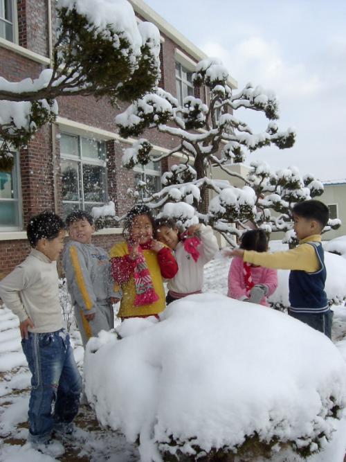 첫눈이 폭설이 되어 내린 날. 모두 일찍 학교에 왔어요. 눈처럼 하얀 미소가 아름다운 1학년. 정원수가 멋진 배경이 되어 주었어요.