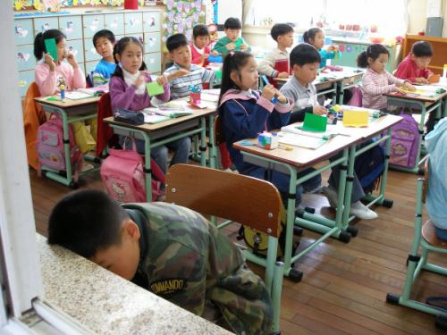 친구들은 모두 색종이로 오리고 붙이고 재미나게 작품을 만드는데 떠들다 걸린 친구 한명 생각하는 의자에 앉게 되었어요. 둘씩 사이좋게 앉아 공부하는 오천초등학교(교장 한상윤) 2학년 친구들.