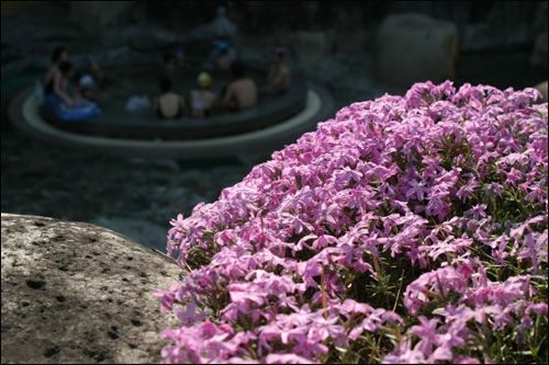 노천온천탕에는 관광객들이 여유롭게 온천욕을 즐기고 있다. 꽃도 아름답지만, 여유로운 주말을 즐기는 사람들이 꽃보다 아름답다. 꽃과 온천 사람이 어우러지는 풍경 사이로 봄햇살이 따사롭다. 위쪽으로 조금 더 오르자 꽃잔디가 보인다. 꽃잔디는 지면패랭이꽃으로도 불리는데, 미국 동부가 원산지이다. 꽃잔디 뒤로 보이는 노천온천탕의 풍경도 좋다. 역광이라 카메라에 제대로 담기가 어려울거라 생각했는데, 오히려 분위기있는 장면을 담을 수 있어서 좋았다. 분홍색으로 둥글게 피어있는 꽃잔디와 원형의 노천온천탕이 만나 8자 모양을 하고 있어 재미있는 사진이 되었다.