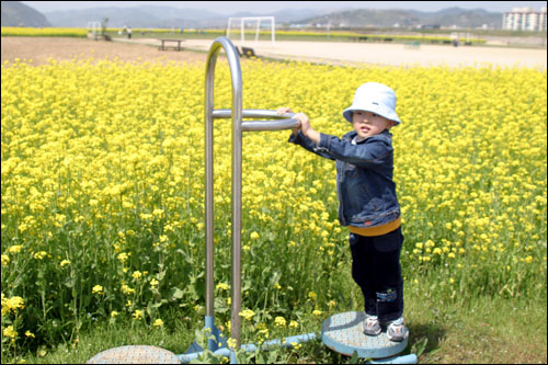 병찬이가 운동기구에 매달려 이리 빙글, 저리 빙글 돌기 시작했다. 유채꽃밭 앞에서 운동을 하고 있으니 아들의 몸에까지 노란물감이 스며드는 느낌이다. 낙동강변에 조성되어 있어 더욱 운치가 있다.