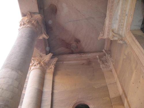 왕관 옆에 많이 퇴색된 독수리 두 마리가 왕관 양쪽을 호위하고 있는 모습이 보인다. 자세히 살펴야 그 모습을 이해할 수 있다. 이 신전 가운데 왕관 바로 위에 둥근 항아리 조각 같은 것이 보인다. 이 항아리 안에 당대의 신비를 역사를 간직한 보물을 숨겨놓았을 것으로 추정하고 있다. 그래 항아리 때문에 이 건축물을 보물창고로 부르고 있단다.