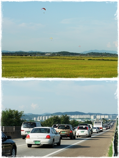 사는 모습이 참 다양화된 세상이다. 추석날 오후라 중부고속도로 위의 차량들은 제자리걸음을 하고 있는데 어떤 사람들은 하늘에서 들녘을 내려다보며 패러글라이딩을 즐기고 있다. 조상 잘 모시고 가족들과 화목을 다지는 일이라면 얼마나 좋은 일이겠는가?