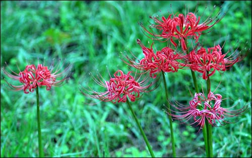이른 시간인데도 공원에서 운동을 하는 마을주민들이 제법 많다. 4년만에 다시 찾은 상림공원은 너무나 다른 모습이다. 예전에는 주차장도 없었는데, 이제는 넓은 주차장에다 주민들을 위한 운동기구와 관광안내소, 매점까지 들어서 있다. 그리고 주차장 주변에는 식당들도 많이 들어서 있다. 연잎이 무성한 연못도 보인다. 그리고 예전에는 볼 수 없었던 꽃무릇이 화려한 자태를 뽐내며 숲속의 한켠을 차지하고 주인공 행세를 한다.