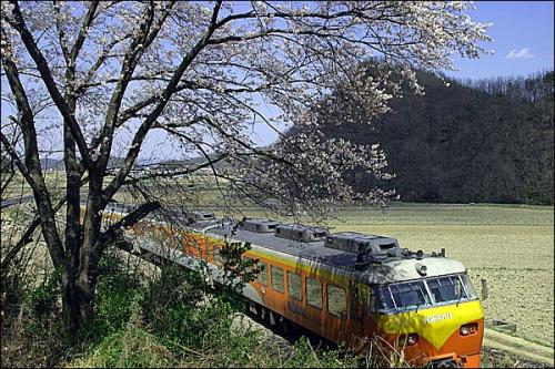 열차시각표를 보니 이내 다시 기차가 들어올 시간이라 철길 건널목 있는 곳으로 내려섰다. 건널목 건너편에서 벚꽃이 만개한 언덕 쪽으로 바라보니 S라인이 선명하게 들어온다. 그 사이로 기차가 뱀이 또아리를 틀 듯 몸을 비꼬며 선로 위를 미끄러져 지나간다. 기차는 원북역에서 잠시 멈춘다. 손님 몇 명을 내려놓고는 다시 역을 빠져나가 반대편으로 멀어진다.