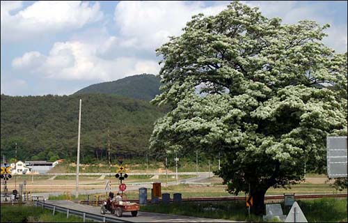 철길건널목 앞에서 요란한 기적소리를 울리던 기차가 이팝꽃이 만개한 나무와 느티나무 3형제 옆으로 빠르게 지나간다.
