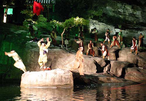 전쟁씬에서는 강변에서 진주성 위로 폭죽이 쏘아올려졌다. 진주성 주변을 불야성으로 밝히며 화려한 불꽃이 터지자 관람객의 환호성이 터져나왔다.