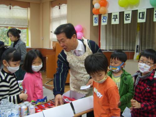 칭찬쿠폰은 한 학생당 100포인트까지 받을 수 있으며 이에 해당하는 포인트로 다양한 종류의 학용품과 먹거리를 구입할 수 있다. 이번 칭찬 쿠폰 대잔치에는 특히 이동현 교장이 판매 도우미로 앞치마를 두르고 학생들과 즐거운 시간을 함께 했다. 이 교장은 ‘칭찬은 고래도 춤추게 할 수 있다’며 칭찬을 통해 긍정적인 자아 개념을 심어 주고 더불어 행동을 변화시킬 수 있는 효과적인 방법임을 교사들에게 강조해 왔었다.