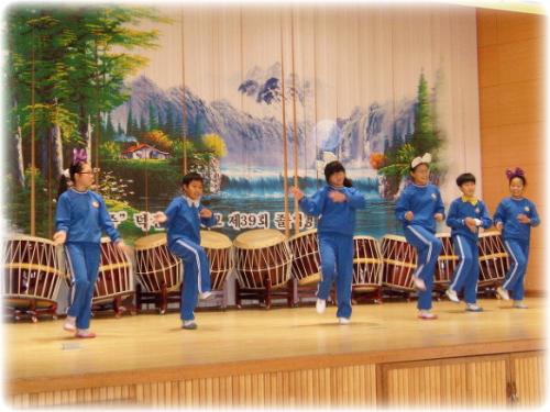 악기 연주에 무용, 학부모를 위한 춤까지 선사하여 가장 많은 박수를 받았답니다. 특히 튀는 의상을 준비하여 남자 어린이가 입은 노란 치마는 노란 한지로 만들어서 춤을 출 때 매우 멋졌답니다. 2년 전 제가 가르친 아이들이 자라는 모습을 곁에서 보는 재미도 여간 쏠쏠하답니다. 시험지를 주면 자올자올 졸던 키 작은 꼬마 김현민의 노래 솜씨가 빛나던 무대, 얌전하던 부끄럼쟁이 아가씨들이 엉덩이를 씰룩거리며 즐겁게 춤추던 모습이 잔상으로 남아서 아직도 즐겁습니다. 예술적이신 최명화 선생님의 기지에 다시 한 번 감사드립니다.