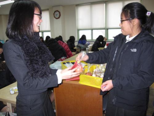 위클래스에서는 지난 23일 원활한 행사 진행을 위해 본교 적십자 단원들 중에서 사랑의 우편배달부 도우미 10명을 뽑아서 편지와 함께 전달할 사과를 깨끗이 씻어 준비하였다.