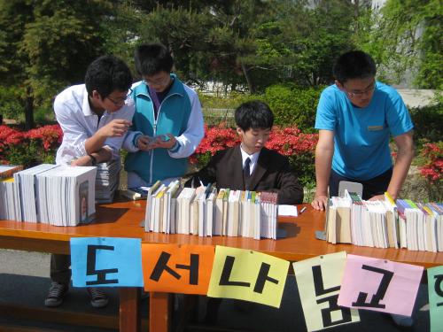 먼저 '도서나눔교환전'입니다. 평소 학생들에게 책의 소중함을 일깨워주고 폭넓은 지식을 습득하고자 하는 취지로 시작된 행사입니다. 학생들은 잠에서 잠자고 있는 도서를 가져와 쿠폰으로 바꾸면 행사 당일날 쿠폰을 제출하면 자신이 읽고 싶은 책으로 바꿀 수 있습니다. 많은 학생들이 참여하여 책의 소중함을 느끼는 시간이었습니다.