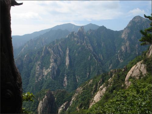 금강굴 갈림길을 지나면서 점점 가팔라진 길은 그 강도를 높여만 갔다. 아직 본격적인 산행은 시작도 못했는데 수통의 물은 반이나 비어버렸고 마른 숨은 더욱 거칠어졌다. 목을 축이며 한숨 돌리자 그제야 주변경관이 눈에 들어온다. 엄청난 바위 절벽이 우리 위에서 내달리고 있었고 등 뒤로는 수많은 암봉들이 군락을 이루며 능선에 박혀 있었다. 거대한 무기고를 메운 예리한 창날들처럼 그 수를 헤아리기 어렵다. 막연하게 떠돌던 설악산의 실체를 확인하는 것 같다. 아마도 수만 년에 걸친 자연의 침식으로 오늘의 모습을 이뤘으리라. 홍수나 산사태와 같은 일시적인 현상으로 생성된 지형과는 확연히 구별되어 보인다.