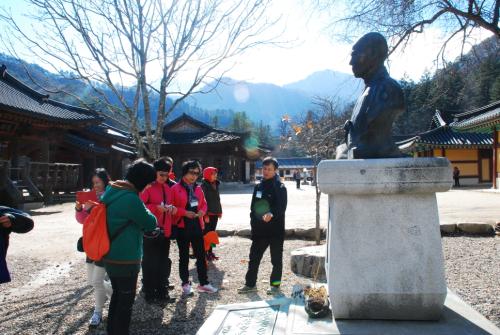 누가 국어교사 출신 아니라고 할까 제일 먼저 향한 곳은 건물 모양이 ㄱ 자 형태로 된 만해 기념관. 출입구에 붙은 '인도에 간디가 있고 조선에는 만해가 있다' 만해 한용운을 세계적인 반열에 올려 놓아도 된다는 말이다. 위당 정인보 선생은 만해의 고결한 지절을 '풍란화 매운 향내'에 비유했다.